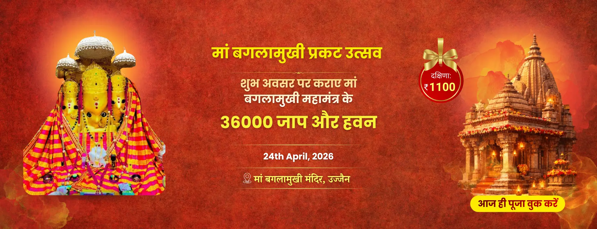 рдорд╛рддрд╛ рдмрдЧрд▓рд╛рдореБрдЦреА рдордВрджрд┐рд░, рдЙрдЬреНрдЬреИрди – рдордзреНрдпрдкреНрд░рджреЗрд╢ рд░рд╛рдЬреНрдп рдореЗрдВ рдЕрдмрд╕реНрдерд┐рдд рд╣реИред рдорд╛рдВ рднрдЧрд╡рддреА рдмрдЧрд▓рд╛рдореБрдЦреА рдХрд╛ рдорд╣рддреНрд╡ рд╕рдорд╕реНрдд рджреЗрд╡рд┐рдпреЛрдВ рдореЗрдВ рд╕рдмрд╕реЗ рд╡рд┐рд╢рд┐рд╖реНрдЯ рд╣реИред Vedic Temple Puja рдордВрдЪ рд╕реЗ рдпреЗ рдЕрдиреБрд╖реНрдард╛рди 24th April рдХреЛ рдЖрдкрдХреЗ рдирд╛рдо рдЧреЛрддреНрд░ рд╕реЗ рд╕рдВрдХрд▓реНрдк рдХрд░рдХреЗ рдпреЗ рд╕рдВрдкрдиреНрди рдХрд┐рдпрд╛ рдЬрд╛рдпреЗрдЧрд╛ред